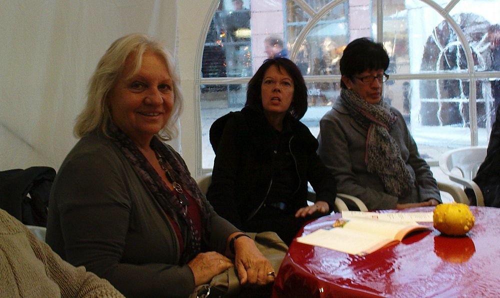 Dann trennten sich unsere Wege für einige Zeit ein zweites Mal. Einigen, denen es im Freien zu kalt wurde, zogen in ein gemütliches Lokal in der Altstadt um. Der Rest erkundete das Weinfest. Im Bereich des Wein-und Sekttreffs spielte die Gruppe SwingOMania jazzig und swingig angehauchte Töne. Die Sängerin Claudia Albrecht hatte die Jungs im Griff und überzeugte mit einer tollen Stimme. Aber auch die andere Seite der Hauptstraße, wo das eigentliche Weinfest stattfand, wurde ausgiebig inspiziert. Hier bekam Vroni endlich ihre Dampfnudel und der Abend war endgültig gerettet.