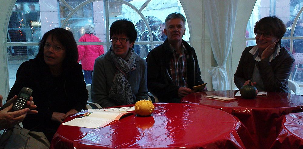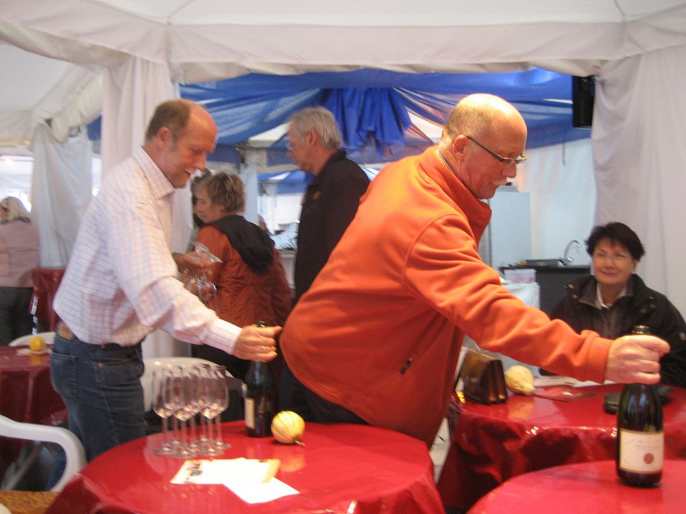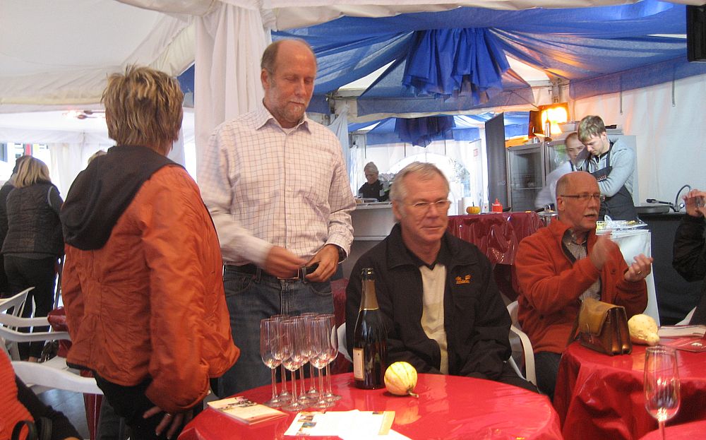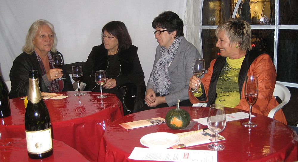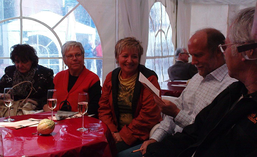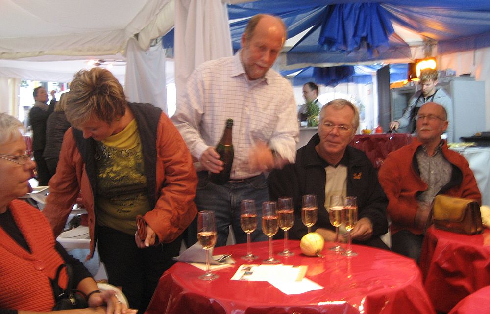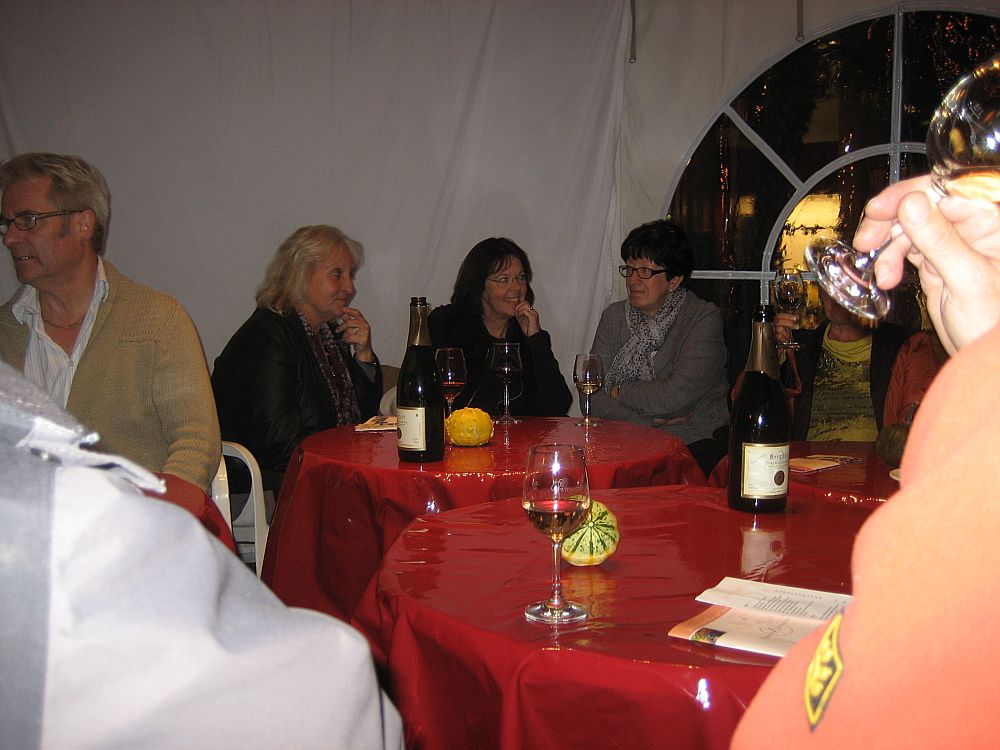 Dann ging es zurück in die Altstadt. Im Gastrozelt von Anatol Ehlert hatten wir die in der Altstadt gebliebenen schon unsere Plätze gesichert. Hier konnten wir uns mit kleinen, feinen Gerichten stärken. Mit zwei Flaschen Sekt von Roland und einer schönen Begrüßungsrede von Roland wurde der Abend eröffnet. Bei dieser Gelegenheit dachten wir auch an Hermann, der gerne dabei gewesen wäre. Eine Krankheit hinderte ihn daran. In den umliegenden Zelten konnten wir uns mit feinen Weinen aus der Region versorgen.