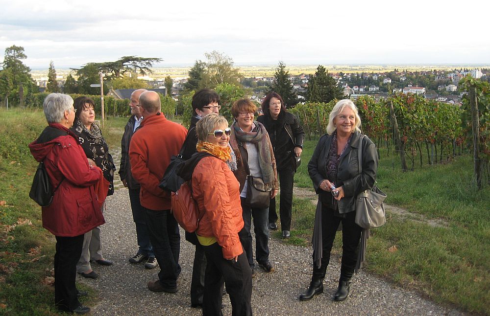 Also noch genügend Zeit, um vorher Neustadt zu erkunden. Die temperaturen waren im Laufe der Woche ins bodenlose gefallen. Deshalb wärmten wir uns zuerst gemeinsam in einem Café mit historischem Ambiente auf. Anschliessend trennten wir uns für kurze Zeit. Einige blieben in der schönen Altstadt. Der Rest vertrat sich die Beine bei einem kurzen Spaziergang. Es ging über viele Stufen hoch zum Stadtteil Haardt. Das Ziel war die Dr. Welsch Terrasse. Die Atmosphäre inmitten der südlichen Pflanzen ist hier einzigartig. Die Zeit drängte. Zu einem kurzen Abstecher in die Weinberge mit Gruppenfoto reichte es aber noch.